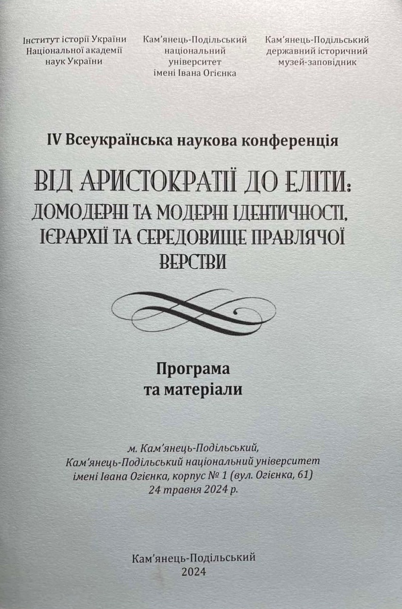 IV Всеукраїнська наукова конференція “Від аристократії до еліти: домодерні та модерні ідентичності, ієрархії та середо- вище правлячої верстви”: Програма та матеріали. Кам’янецьПодільський, 24 травня 2024 р. Київ: НАН України, Ін-т історії України, 2024. 80 с.