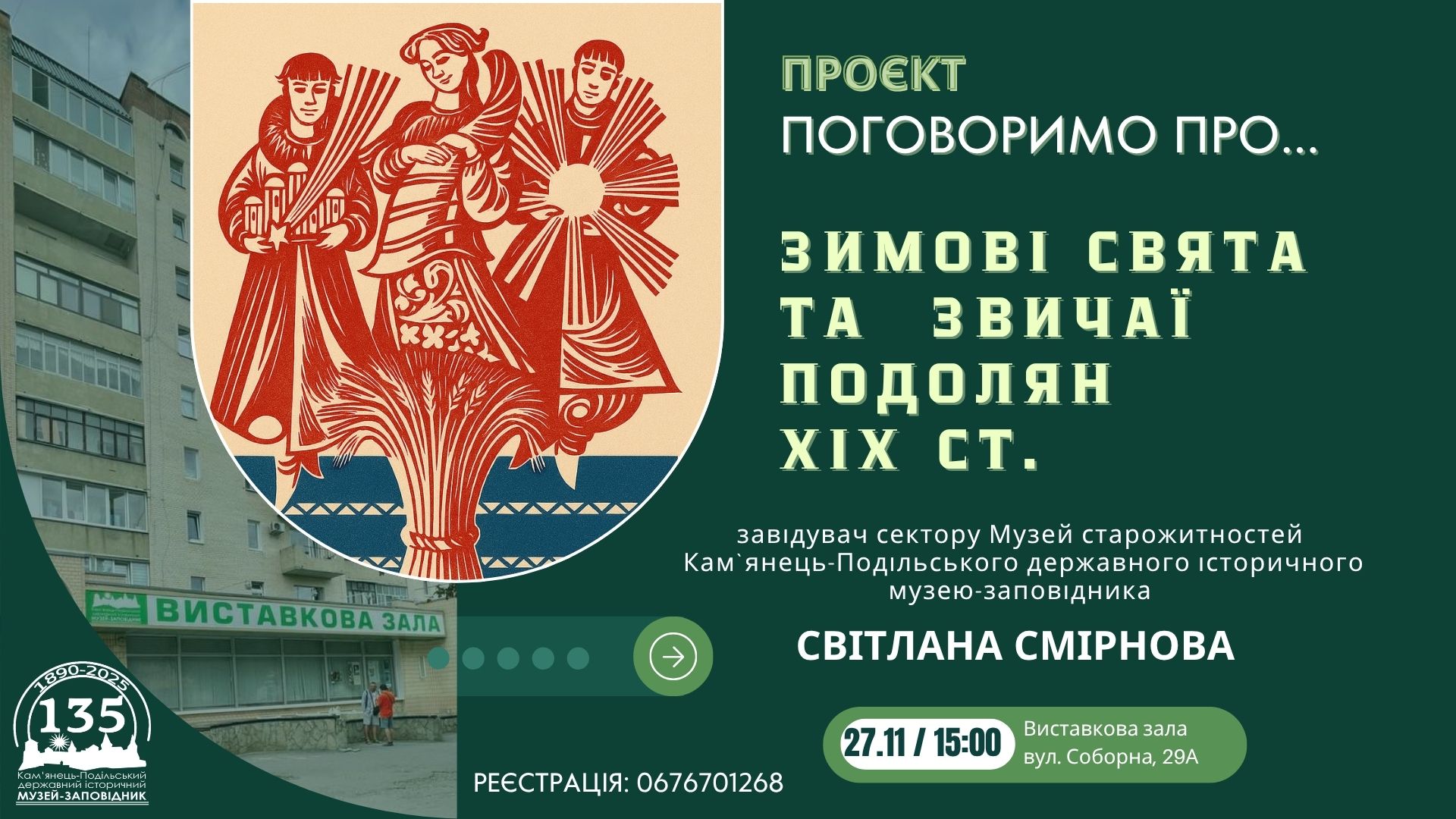 27/11 Проєкт «Поговоримо про...зимові свята та звичаї подолян XIX ст.» з Світланою Смірновою, завідувачем сектору "Музей старожитностей" Кам`янець-Подільського державного історичного музею-заповідника, Виставкова зала